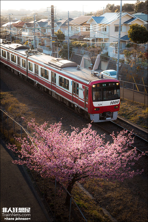 2018年2月27日,日本神奈川县三浦市,京急1000形与盛开的樱花。