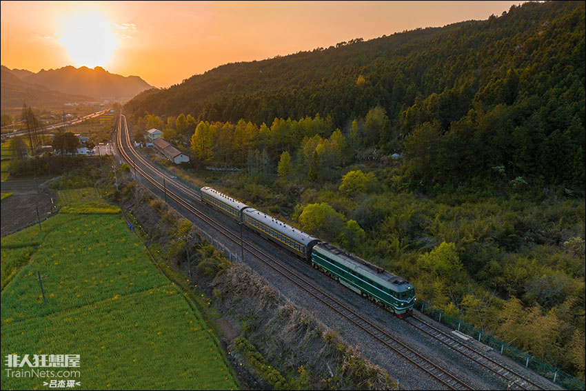 2023年4月1日,8462次通勤列车在夕阳下驶出皖赣铁路岩前站。