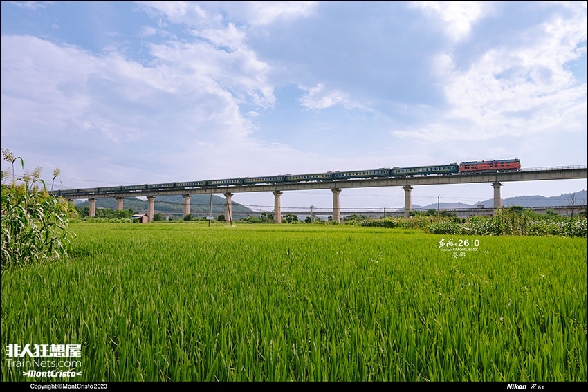 2023年7月1日。K575次(上海南-永州)办完通勤后驶过益湛线芦洪市镇的一片稻田,得益于电厂专线的货运量,煤列货运已经替代通勤成为芦洪市站的主要业务。