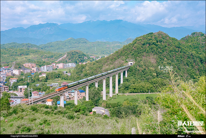 2023年7月3日,益湛线,K575次(上海南-永州)驶出下军山隧道,天公作美,拍摄当天太阳斜照,水汽蒸腾,邵阳境内的越城岭清晰可见。