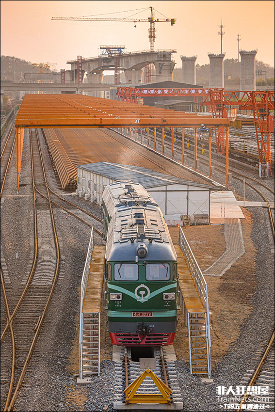 2023年1月24日,金甬铁路,中铁一局的两台东风4在日暮的铺轨基地中待命。