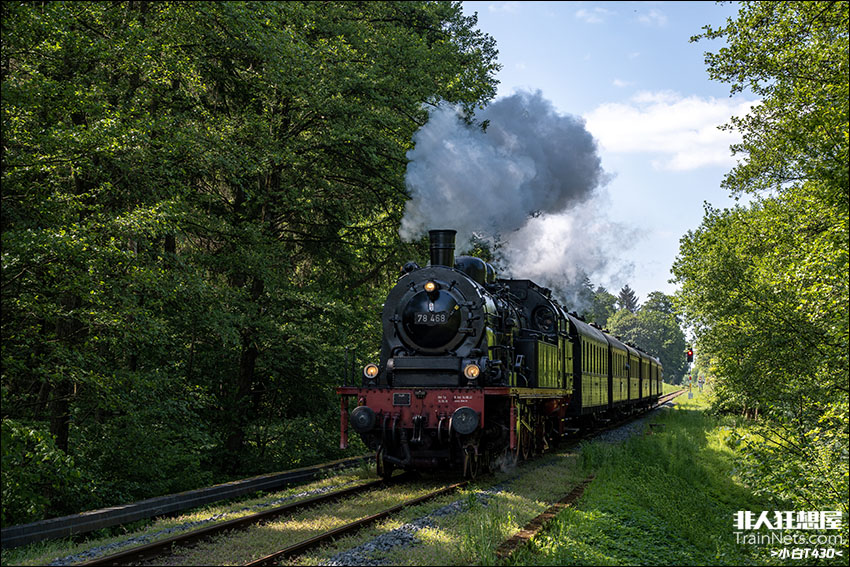 2023年5月,德国比勒菲尔德,BR78 468蒸汽机车牵引老式车厢穿过森林,担当Christi Himmelfahrt日的特殊旅游活动。