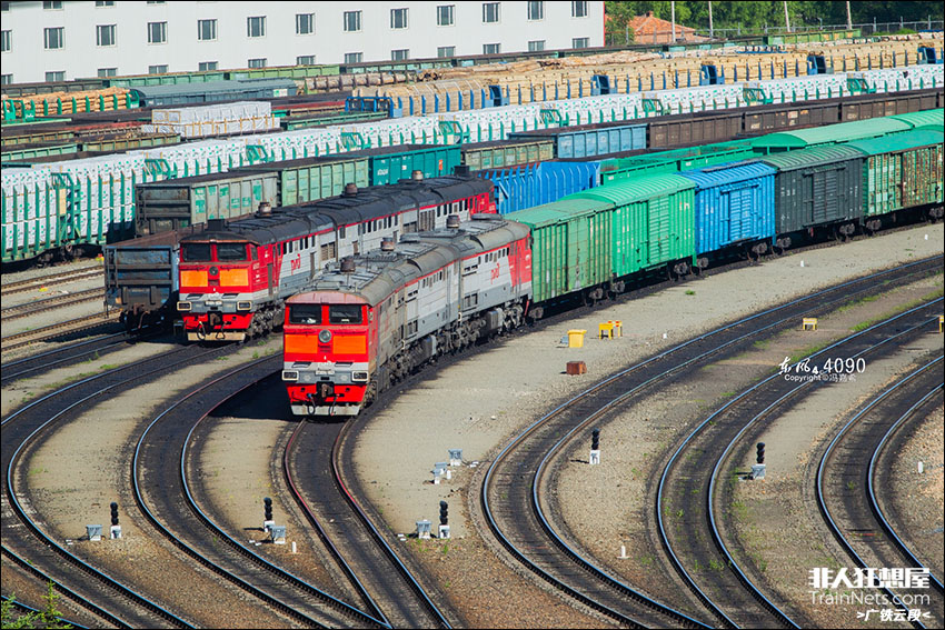 2023年6月,黑龙江绥芬河,两列国际联运列车在绥芬河站宽轨场待发。