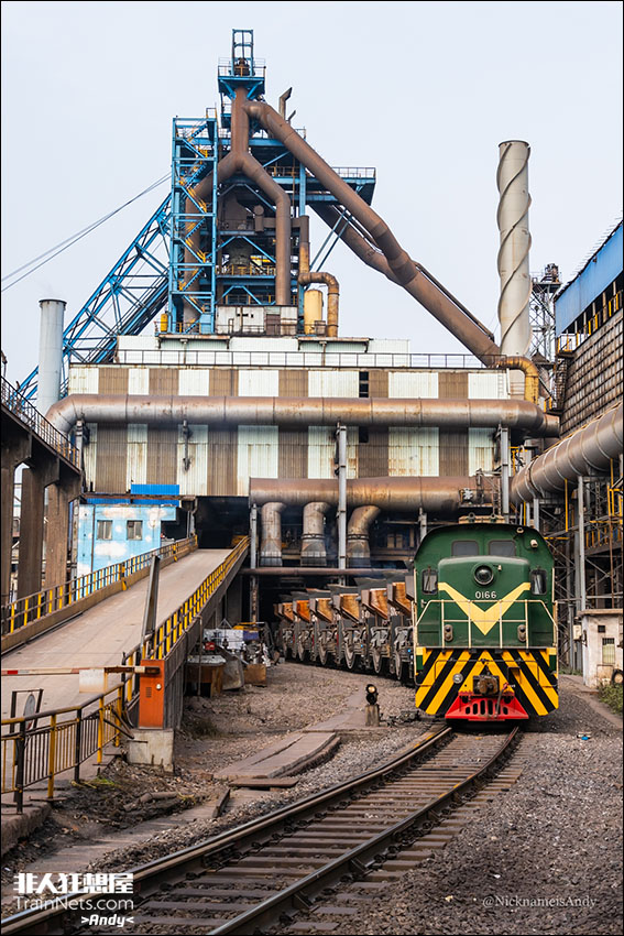 2023年3月11日。推送一长串钢包车的GK1C正在韶关钢铁厂6号高炉出铁口前等待调车信号。