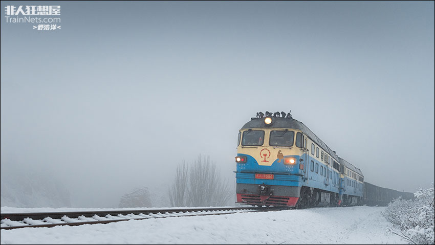 2023年2月。雪后浓雾中,双机东风4B改D牵引货运列车行驶在太焦铁路红崖一带。