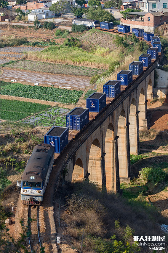 2023年2月12日,昆河线,30033次集装箱大列驶过七孔桥S弯,准备爬上玉林山展线。