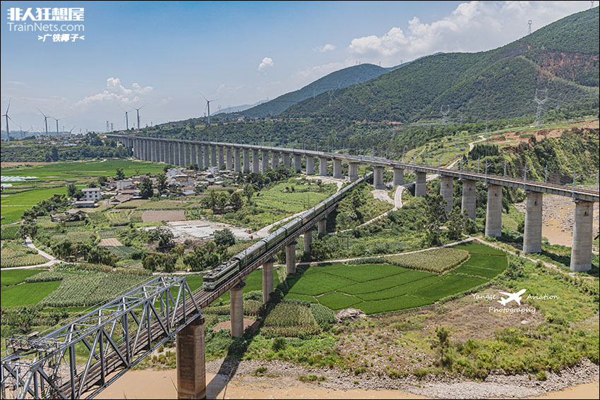 2022年7月28日,SS3牵引5634次(攀枝花南-普雄)行驶在老成昆铁路上,下穿新成昆铁路,准备跨过安宁河。