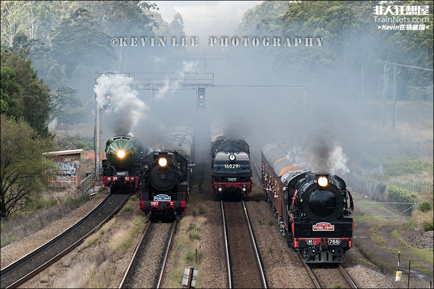 2023年4月。2023年度新南威尔士州猎人谷蒸汽机车节的压轴戏——Great Train Race,4台蒸汽机车在猎人谷主干线的4条轨道上并排赛跑。这4台机车从左到右分别是准高速客运蒸汽机车3801,干线货运蒸汽机车5917,南半球最大的蒸汽机车6029和维多利亚州干线蒸汽机车R766。