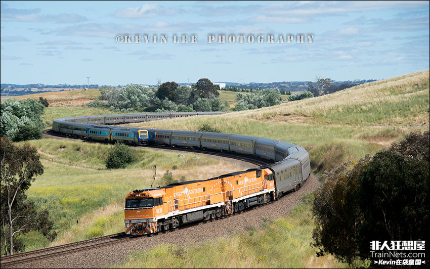 2023年4月。澳大利亚豪华旅行列车伟大南方号(Great Southern)行驶在新南威尔士州的柯乐林(Cullerin)展线群上,正巧碰到下行去往格里菲斯的内燃动车组。