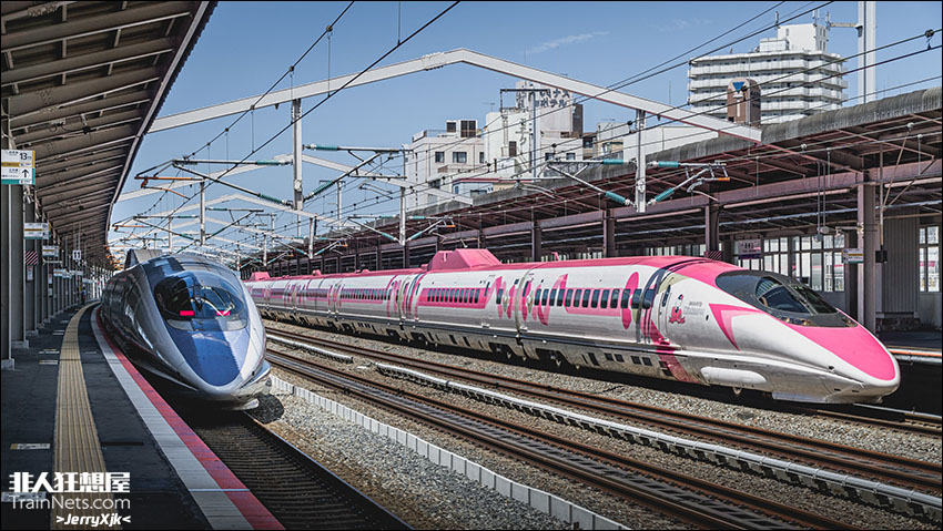 2023年8月4日,日本兵库县,山阳新干线西明石站,由JR西日本500系新干线V2编组的Hello Kitty主题列车担当的こだま842号交汇500系V9编组担当的こだま847号,造就了红蓝500系交汇的史诗级画面。