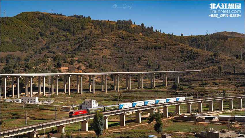 2022年11月,大丽铁路,HXD3D牵引双层旅游车通过挖色附近。