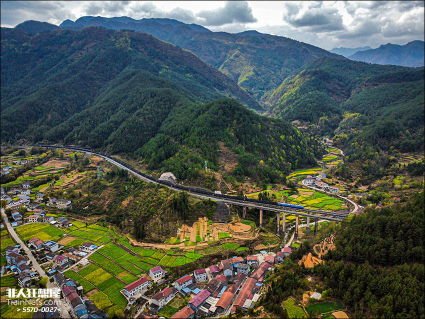 2023年3月,四川江油雁门镇,上行货车通过宝成铁路斑竹园车站。
