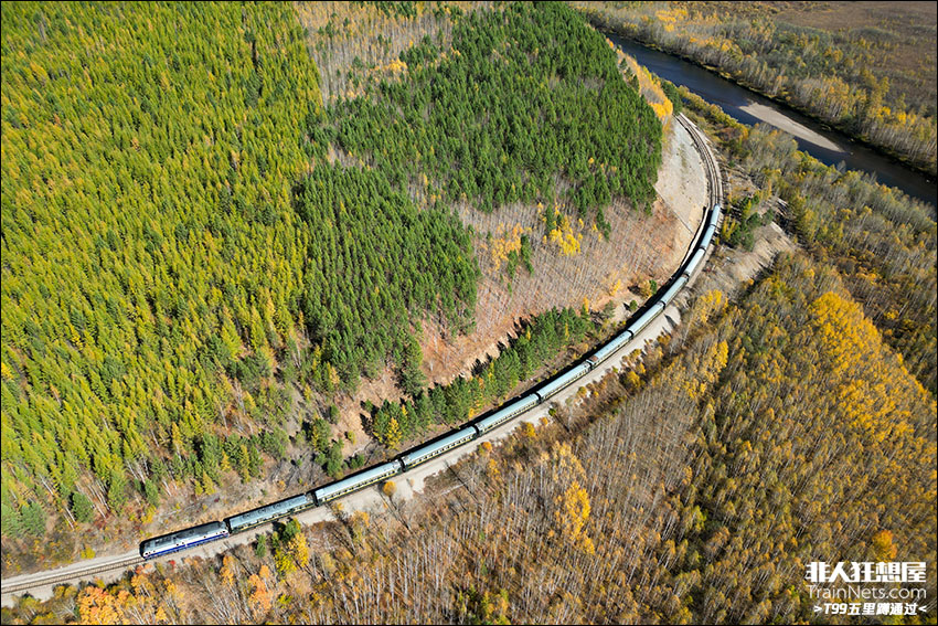 2023年9月15日,嫩林线,K7041次(哈尔滨-漠河)穿行在植被丰富的额木尔河畔,前往漠河方向。