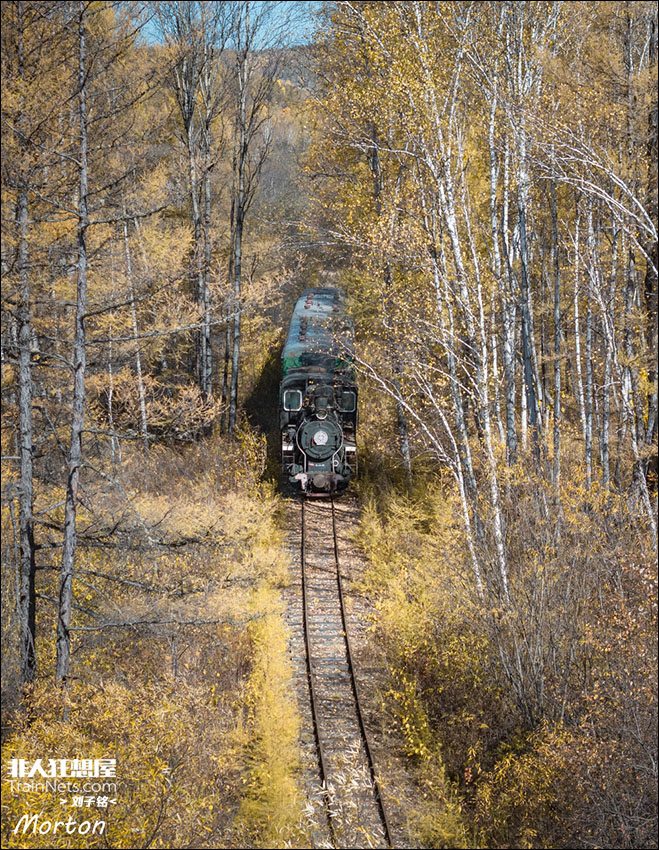 2023年9月23日,内蒙古呼伦贝尔,窄轨蒸汽机车行驶在林间。穿行在大兴安岭深处的阿里河森铁是国内最后的林区窄轨蒸汽机车。