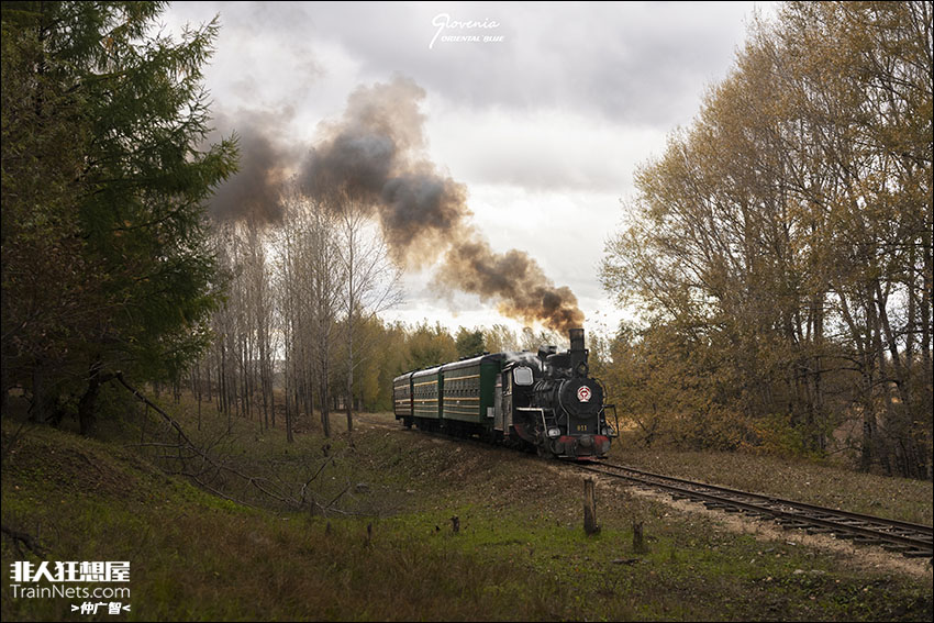 2023年10月4日,桦南森铁,C2蒸汽机车牵引旅游列行走在原七星林场方向的铁轨上,接近向阳湖景区。