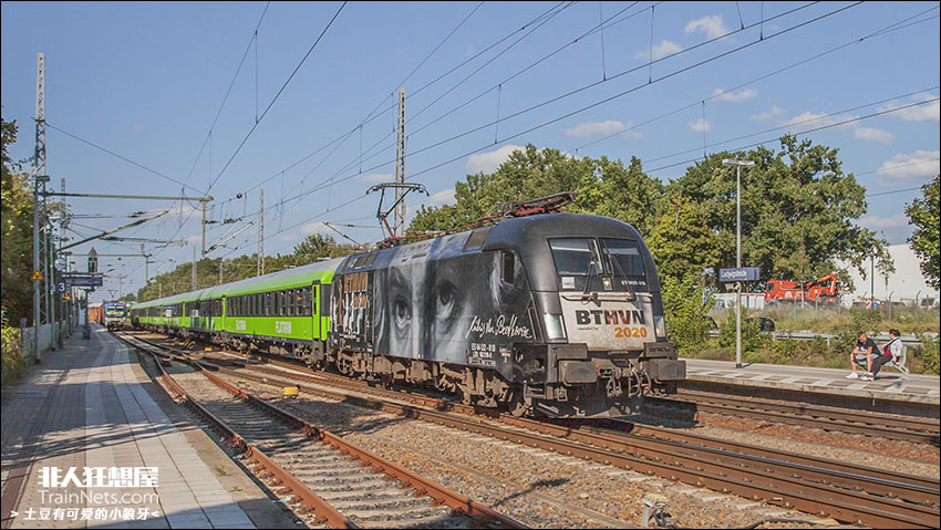 2023年9月。ES64U2-010 “BTHVN 2020”彩绘涂装机车牵引Berlin-Stuttgart FLX1247次通过Ludwigsfelde站。