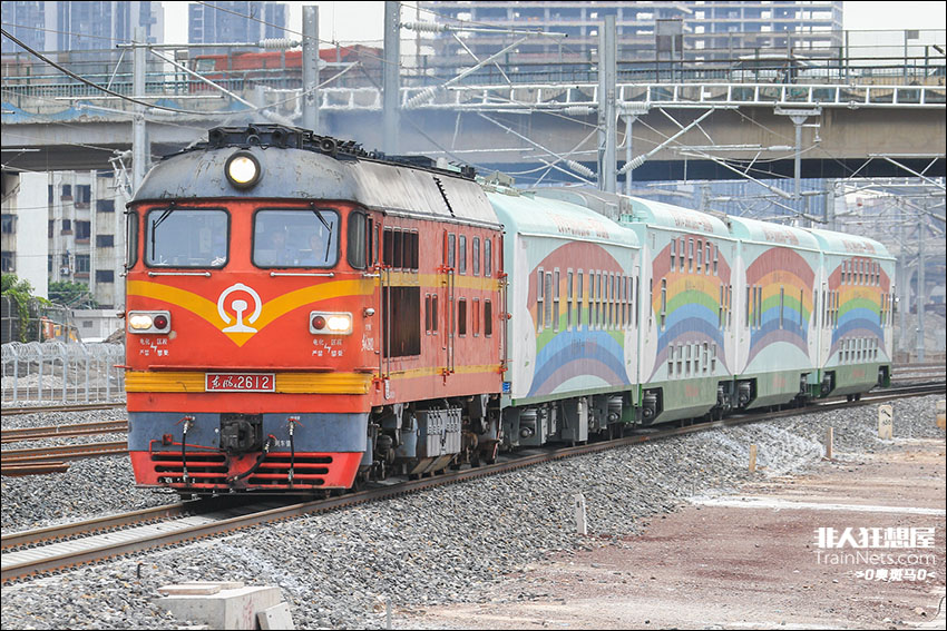 2023年10月11日。广东广州。DF4B-2612牵引健康快车57118次驶过小坪立交桥,列车将经由京广线-广珠货线-广茂线前往广东阳江。