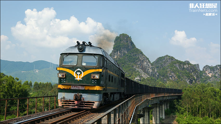 2023年10月1日,喷涂着龙川路徽的中铁阳江东风47761机车,牵引重车驶出阳春站。