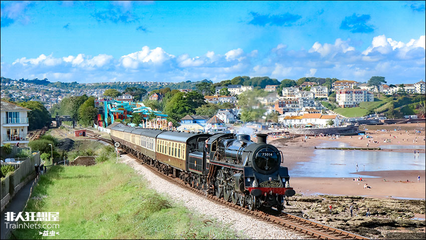 2023年8月。英国也少有几天夏日的气息,趁着难得的晴天,达特茅斯蒸汽铁路的小火车驶过Paignton海滩,前往Kingswear。
