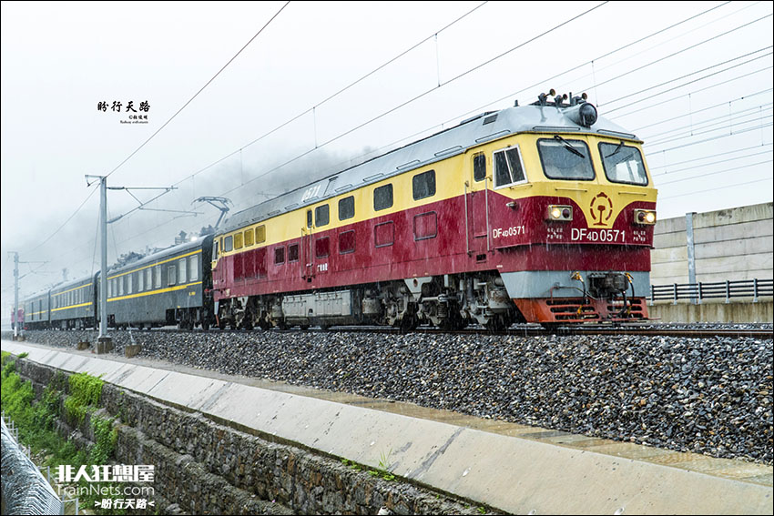 2023年8月18日。距离广汕高铁开通的日子越来越近,广州局从广铁汕段派出两台DF4D机车编入WX25T 999246、WX25K 998845组成检测列车对新塘动车所A/B线进行最后的联调联试检测。暴雨下“虎集”检测车接近新塘动车所。