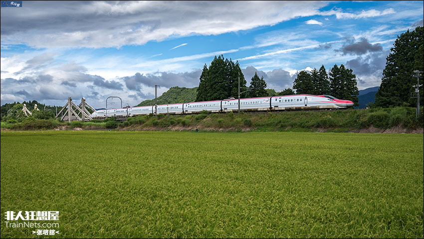 2023年8月14日,日本秋田县大仙市,E6系新干线在田野上飞驰。