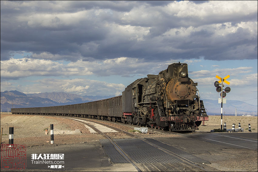 2023年8月,天山下,建设型蒸汽机车牵引煤炭列车通过G312道口接近运销南站。