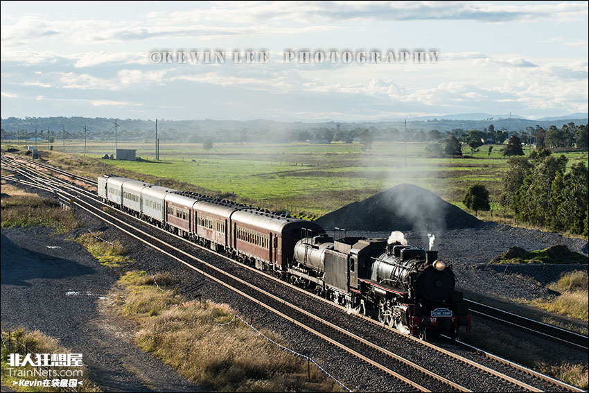 2023年4月。5917牵引的特别列车行驶在猎人谷主干线上。这趟列车是2023年猎人谷蒸汽机车节活动的一部分,列车会从Maitland车站出发驶入猎人谷主干线,并在Singleton附近的一个煤矿里通过灯泡线折返。