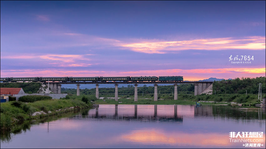 2023年8月11日。桃威线。清晨,DF4B牵引客车K1065次(武昌-威海)驶过烟台市桃村镇某铁路桥。