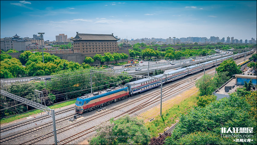 2023年5月。陕西西安,陇海铁路。SS7D牵引双层特快车驶过西安城门之下。