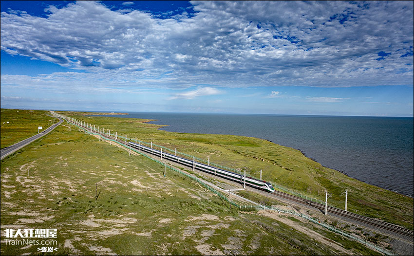 2023年8月,昆明局借调青藏公司的CR200J1D型“AD钙”涂装高原型动集担当C892次(格尔木-西宁)列车行驶在青藏铁路鸟岛站附近的青海湖畔。