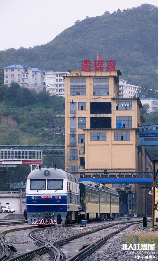2023年9月,阳泉,荫营矿选煤厂装车站是石太铁路白荫支线的终点,DF11牵引检测列车深入了这条支线,准高机车和客车停在装车塔下的场景非常难得一见。
