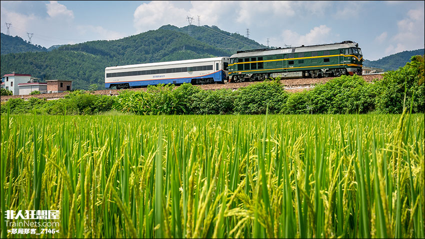2023年9月,漳龙铁路轨检车驶过丙村车站附近的稻田。