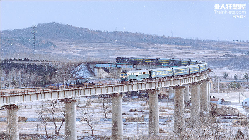 2023年1月15日。桃威线。阵雪中,K1066次(威海-武昌)驶出乳山车站。