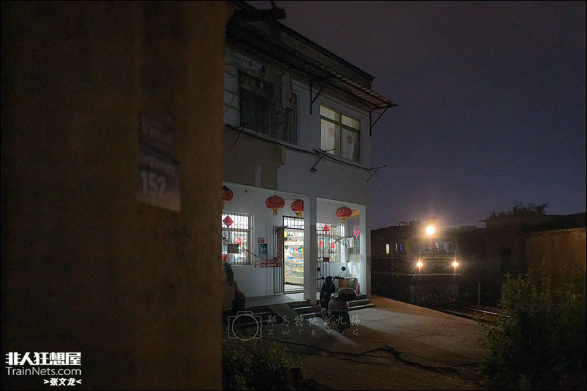 2023年10月。夜幕下,上局宁东段DF11牵引K783次(昆山-萍乡)马鞍山站发车,在夜幕中穿过陶庄村中心的小卖部旁,向远方驶去。