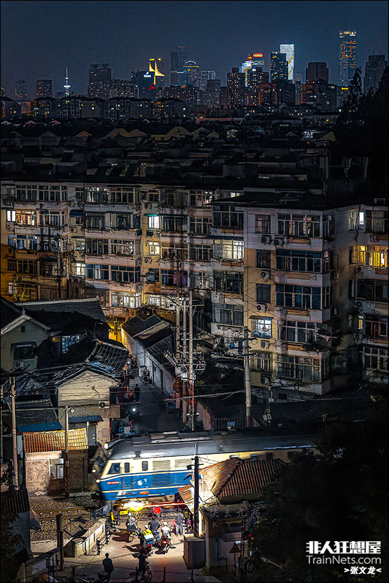 2023年5月14日。夜幕下,上海铁路局南京东机务段DF11牵引K1325次(苏州-南昌)穿行于南京市内,行驶在宁芜铁路上 如果说十六缸发动机的轰鸣加上火车过道口的鸣笛,住在这里的人是忍耐还是习惯?