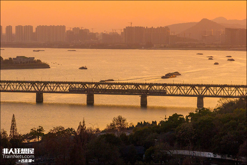 2023年12月22日,“狮集”列车完成甬金铁路检测任务返回杭州,途径夕阳下的钱塘江大桥。