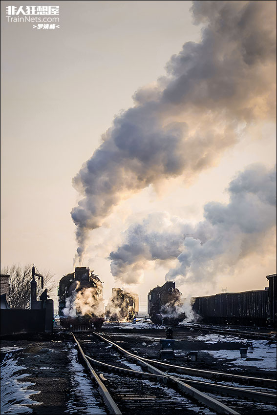 2017年1月20日。新疆哈密三道岭。清晨运销南站,三台建设型蒸汽机车一同进行整备作业。