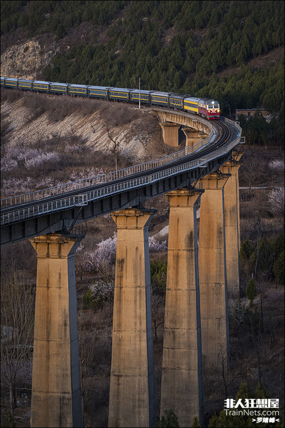 2023年3月12日。京原铁路。清晨的金光照亮巨型桥墩,K602次(太原-北京西)列车迎着朝阳接近云居寺站。