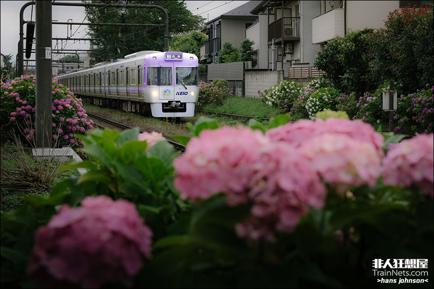 2023年6月11日,东京都。京王1000系驶过滨田山。每到6月初,井之头线沿线紫阳花盛开,成为赏花名所。