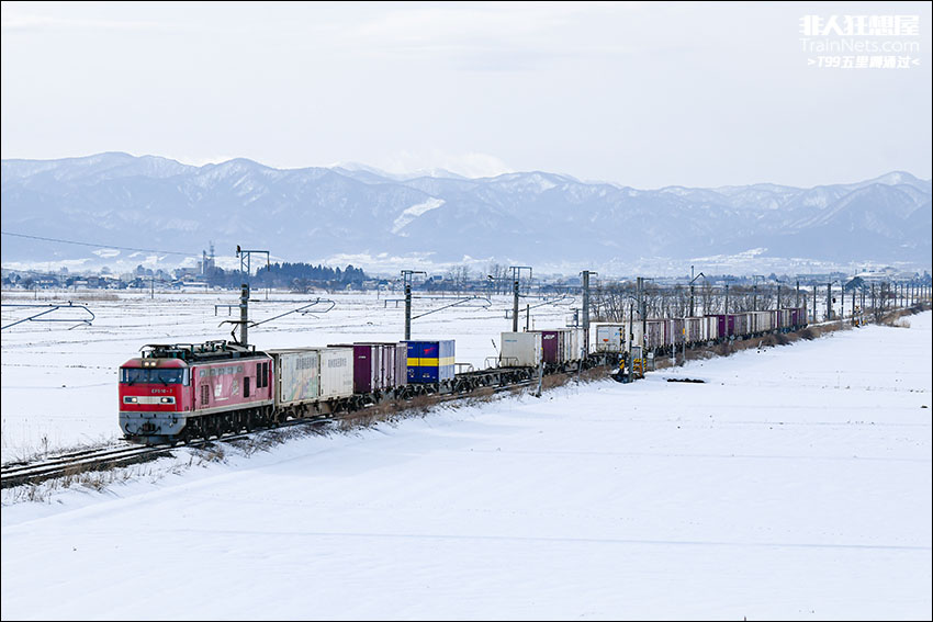 2024年1月18日,奥羽本线,JR货物涂装的EF510牵引3099次货列穿过青森乡间覆雪的稻田,接近浪冈站。