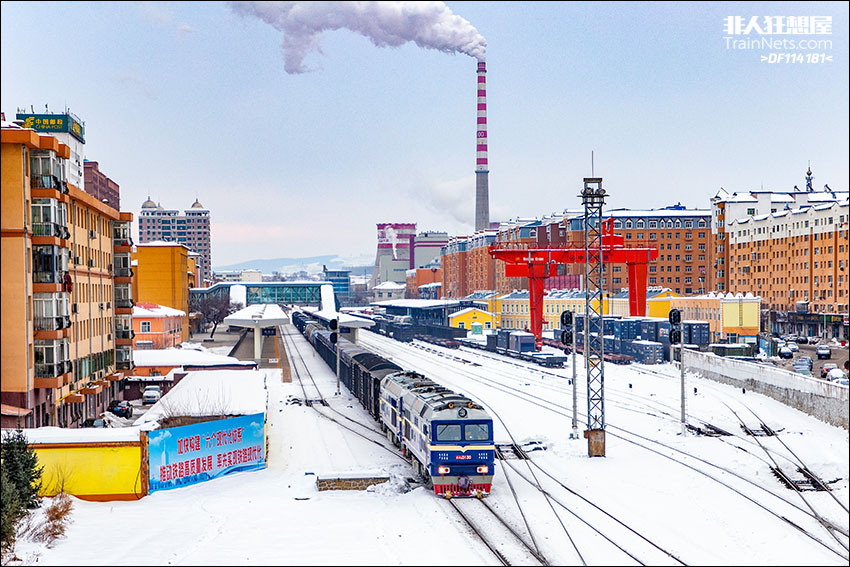 2023年11月,黑龙江鸡西,大雪后的林东线,双机DF8牵引货列驶出鸡西站,去往鸡西西场。
