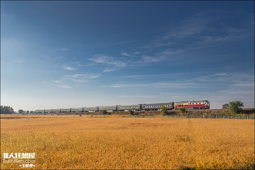 2023年9月30日,哈局三段DF4D牵引K383次(北京-齐齐哈尔)运行在金黄的稻田上。