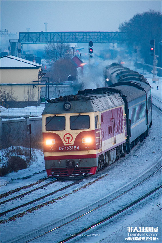 2024年1月17日,绥佳线,傍晚时分,原济局济段转哈局佳段DF4D-3154牵引K7105次列车(嫩江-佳木斯)出绥化站。