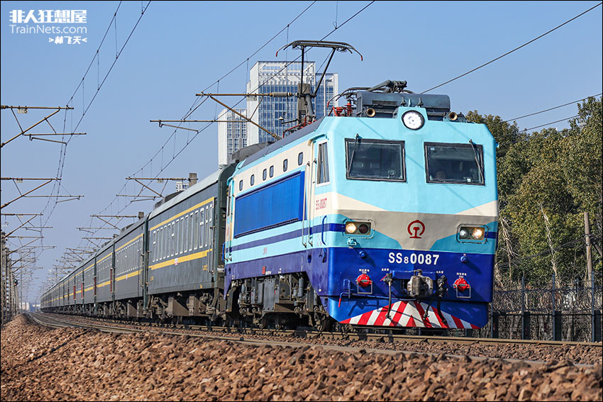 2024年2月。浙江杭州。SS8-0087牵引K808次(怀化-无锡)行驶在沪昆铁路上,即将驶入杭州南站。