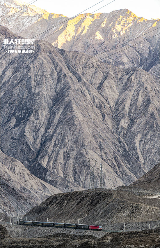 2023年12月27日,嘉镜线,韶山7E牵引7530次(镜铁山-嘉峪关)在冬日的阴影中驶出曲折的河谷,背后积雪的山峰上还沐浴在夕阳金光中。