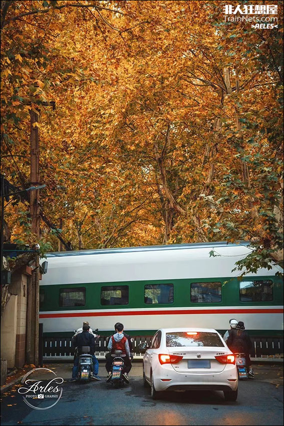 2022年12月,南京浦口。新一代CR200J动车组列车正在浦镇车辆厂龙虎巷道口调车。