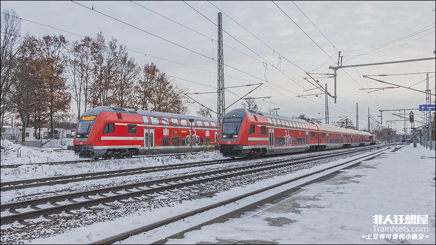 2023年12月。德国柏林。雪中DB Regio运营的RE3线和RB32线双层列车同时停靠在Ludwigsfelde车站。