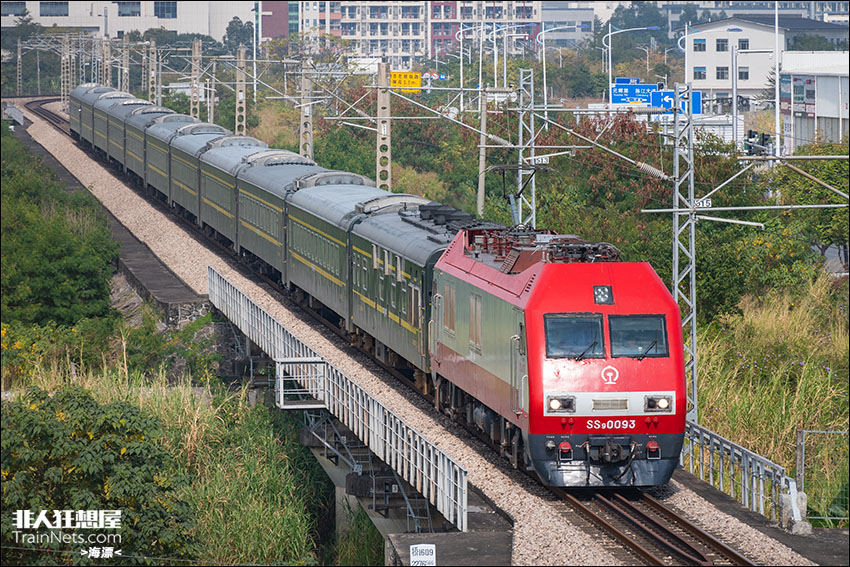2023年12月30日。京九铁路,经典烧酒伪直特组合T8367次( 梅州-广州)列车,带着全路罕见的全列软座车“原”广九直通车RZ25Z型客车,通过陈江经典机位甲子路立交桥。