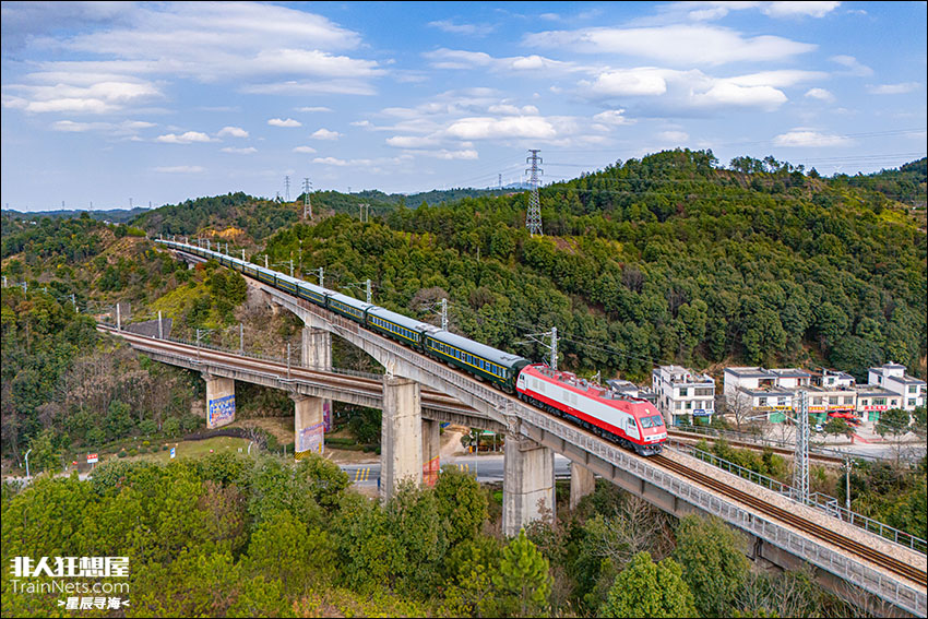 2024年2月13日。K1665次(南昌-广州白云)行驶在赣韶铁路联络线上,列车即将进入正线,下方为京九线,前方到站为大余站。