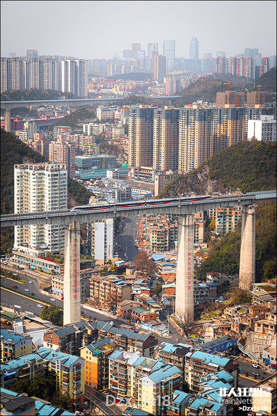 2024年2月12日,C5873次(贵阳北-花溪大学城)穿行在贵阳城区,远处高架即为沪昆高铁,与其共同构成了贵阳的城建奇观。